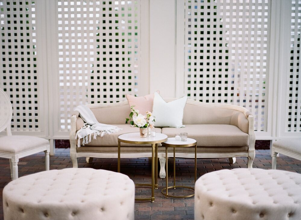 Blair and Danny's wedding vision came to life with blooms cascading down the stairwell, on the homes original mantels and beautifully dangling from the beams of the Carriage House. Even the market lights were wrapped with greenery - the lawn was sparkling all night long! Adding beauty and intimacy to their reception space were sensational furniture pieces and warm linens that matched their palette perfectly. A feature we loved ever so much was their bar. One of our favorite details was the hanging lanterns around the Carriage House bar that continued their modern, luxurious vibe.