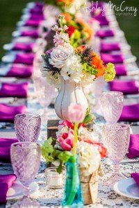 Their family style tables setting were to die for with pops of purple, blue and pink hues. The open patio was topped with twinkling market lights that set the mood of the romantic evening created by the fabulous Orangerie Events.