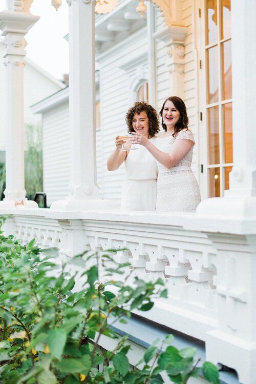 Suz: “Truth be told, I picked out both of our outfits! We both ended up in wedding dresses (and reception jumpsuits!) from BHLDN. I tried mine on at a trunk show at our local Anthropologie and had the classic feeling of never wanting to take it off - I knew it was the one! And it was not at all what I was expecting to love - an off-the-shoulder, form-fitting lace dress by Tadashi Shoji. Finding a dress for MC was easy; I knew she wanted something classic and simple and her dress by Jill Stuart was perfect. We both ended up in Jill Stuart jumpsuits for the reception; perfect for dancing!”